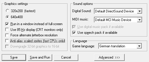 Der Charme dieser Adventure ist nie verblichen! Maniac Mansion Deluxe kommt in einer Multi-Language-Version in welcher selbstverständlich auch die deutschsprachige Version implementiert wurde. Standartmäßig ist englisch eingestellt. Einfach unter “Configuration” Game language “German translation” wählen. Unter “Graphics settings” empfehlen wir die Einstellungen “640 x 400” und “Run in a window instead of full-screen” (siehe hierzu auch Bild links “Spieleinstellungen).